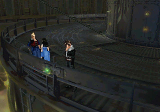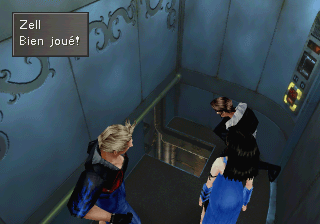 Une fois passé le tutoriel, suivez le chemin jusqu'à une nouvelle échelle à descendre. En bas entrez par la petite porte à l'opposé de l'échelle. Dans la nouvelle salle appuyez sur Croix derrière la valve, puis appuyez 100 fois sur Carré en moins de 10 secondes pour l'ouvrir. Impossible ? Tout à fait (7). Heureusement un coéquipier vient à la rescousse. Cette fois il faut appuyer 50 fois sur Carré en moins de 10 secondes. Déjà beaucoup plus réaliste. Si vous échouez à nouveau, un troisième coéquipier est là, et vous n'aurez besoin que d'appuyer 20 fois sur Carré en moins de 10 secondes. Encore raté ? Le jeu vous laissera réussir en n'appuyant qu'une seule fois sur la touche. Ressortez de la pièce, un nouveau passage est ouvert, encore plus profond dans les entrailles de la BGU. Descendez la nouvelle échelle et suivez l'escalier à l'écran suivant jusqu'à une plus grande zone. Là vous avez une source de magie Vie Max. Contournez le pilier central pour arriver devant une nouvelle échelle. Squall vous donnera le choix de qui envoyer, mais qu'importe votre réponse il ira tout seul. Grimpez donc l'échelle, vous atterrissez non sans mal dans une salle de contrôle. Allez sur l'ordinateur à droite, puis redescendez par l'échelle. Vos coéquipiers vous demande si ça va, répondez ce que vous voulez. Appuyez sur Croix devant la porte au premier plan (là où une lumière verte scintille) (8). Descendez l'échelle pour arriver à un PDS bienvenu.