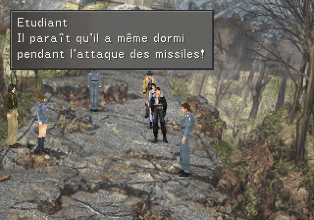 À l'entrée Selphie quitte votre groupe pour prendre de l'avance. Avancez et grimpez le mur via le filet vert à droite, puis continuez tout droit. À la fontaine, puisez à la source de magie FoudreX et ramassez le magazine F.F.F. Aoû (1), cinq pas au sud de la fontaine. Selphie discute avec une amie, celle-ci détient Selphie dans son jeu de cartes, mais vous ne pourrez la défier qu'en revenant à Trabia à la fin de ce chapitre. Allez à l'écran du cimetière à droite pour lire un Timber Maniacs à gauche (2) et puiser dans une source de magie Zombie invisible devant une tombe au centre. Retournez à la fontaine, la suite de l'histoire se trouve au terrain de basket, trois écrans à gauche. Mais avant ça vous pouvez suivre Selphie retrouver des êtres chers.